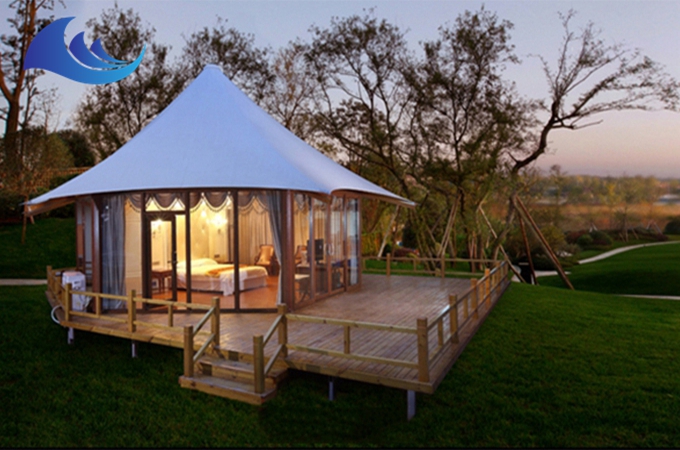 帳篷酒店采用高強度中空鋁合金結構或者是鋼結構,表面具備有防腐處理,優選膜結構頂棚,安全耐用,防水、阻燃、防紫外線。